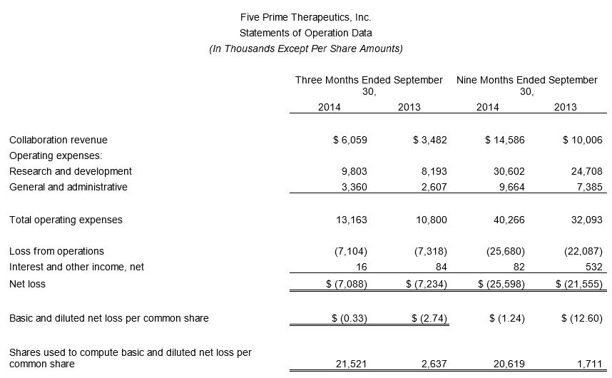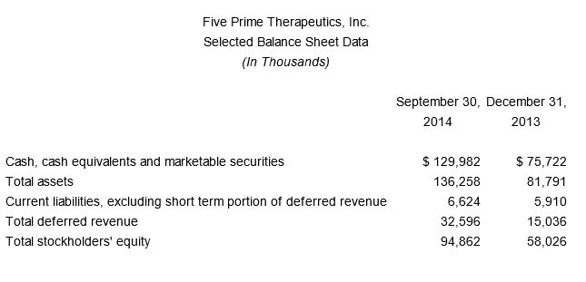 Five Prime Therapeutics Announces Third Quarter 2014 Financial Results